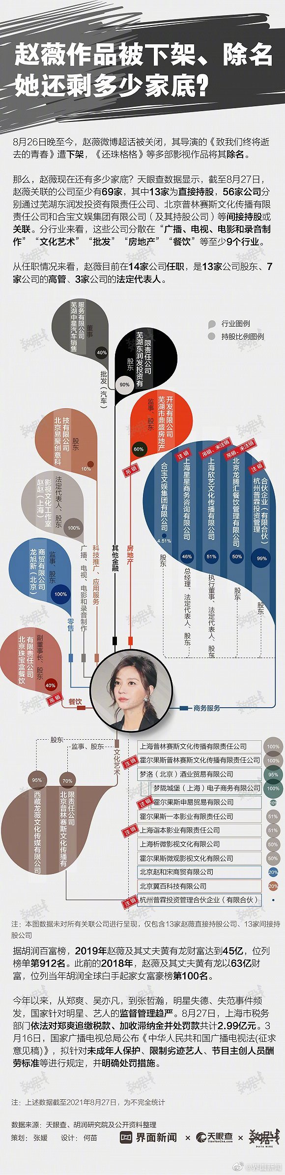 天眼查数据显示,截至8月27日,赵薇关联的公司至少有69家。其中,13家为直接持股。
