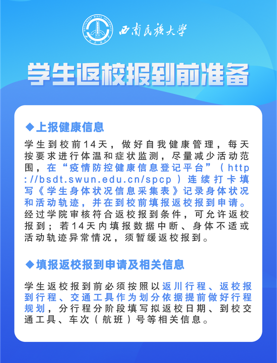 根据上级部门和属地新冠肺炎疫情防控相关工作要求,结合学校疫情防控工作实际,现将西南民族大学2021年秋季学期教职工、学生返校和新生报到相关工作通知如下:
