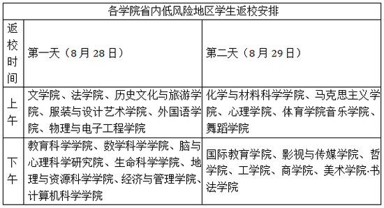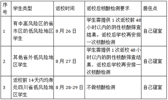 第一批返校学生为有中高风险区的省(市、区)的低风险地区学生,于8月26日返校报到。第二批返校学生为除第一批之外的省外低风险地区的学生,于8月27日报到。第三批返校学生为省内低风险地区学生,含返校前14天内均身处四川省的学生,于8月28、29日报到。新生9月4日报到。