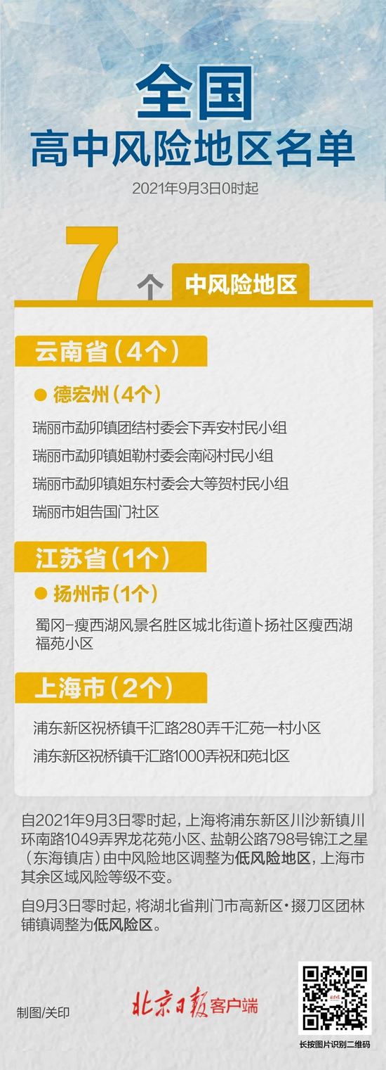 自2021年9月3日0时起,全国共有疫情高风险区0个,中风险区7个。
