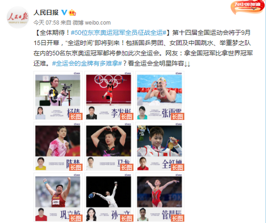 第十四届全国运动会将于9月15日开幕,“全运时间”即将到来!包括国乒男团、女团及中国跳水、举重梦之队在内的50名东京奥运冠军都将参加此次全运会。网友:拿全国冠军比拿世界冠军还难。