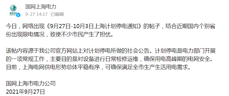另外,27日,国网上海电力官方微博发布情况说明称:网络出现《9月27日-10月3日上海计划停电通知》的帖子,结合近期国内个别省份出现限电情况,致使不少市民产生了担忧。该帖内容源于我公司官方网站上对计划停电所做的社会公告。计划停电是电力部门开展的一项常规工作,主要目的是对设备进行日常检修运维,确保用电高峰期的电网安全。目前,上海电网供电形势总体平稳有序,可确保满足全市生产生活用电需求。