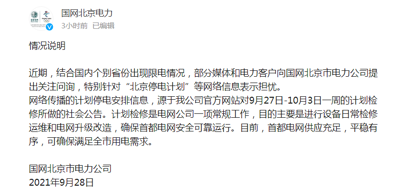 对此,国网北京市电力公司28日对外表示,网络传播的计划停电安排信息,源于公司官方网站对9月27日-10月3日一周的计划检修所做的社会公告。计划检修是电网公司一项常规工作,目的主要是进行设备日常检修运维和电网升级改造,确保首都电网安全可靠运行。目前,首都电网供应充足,平稳有序,可确保满足全市用电需求。