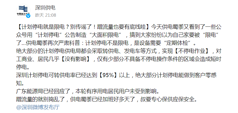 关于相关问题,深圳供电局回应称:计划停电不是限电,是设备需要“定期体检”。绝大部分的计划停电供电局都会采取转供电、发电车等方式,实现[不停电作业],对工商业、居民几乎[没有影响],仅有少部分不具备不停电操作条件的区域会造成短时停电。