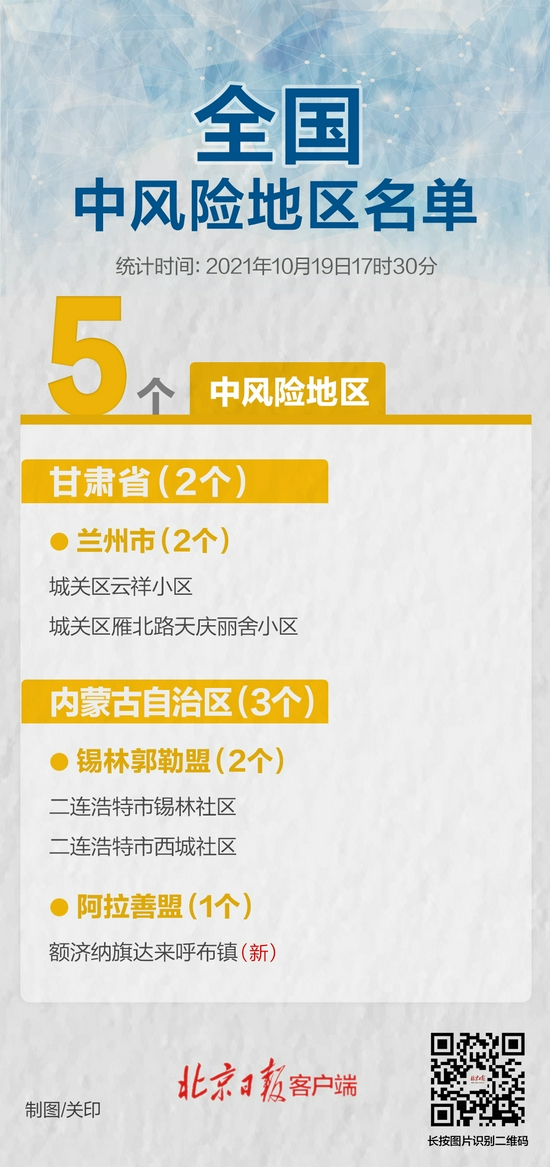 目前,全国共有5个中风险区,分布在甘肃、内蒙古两地。