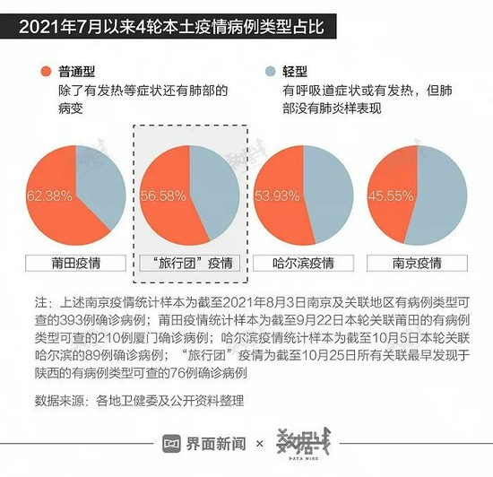 从确诊病例类型来看,与此前4次本土疫情相比,新一轮本土疫情“普通型”病例占比偏高。据界面数据不完全统计,在有明确病例类型通报的新一轮本土76例确诊病例中,“普通型”病例占比达56.58%,比此前南京疫情、哈尔滨疫情分别高出11.03个百分点、2.65个百分点。