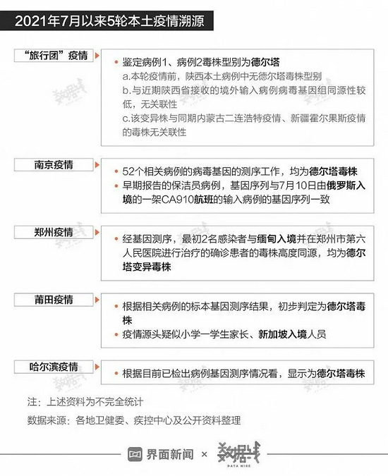 从传播源头来看,和此前4次疫情一样,新一轮本土疫情最早确诊的病例均涉德尔塔毒株。截至目前,南京、郑州疫情已分别“锁定”境外航班、入境确诊人员,莆田疫情疑似源头为入境人员,哈尔滨疫情尚未通报源头,本次新一轮本土疫情流调溯源仍在进行中。
