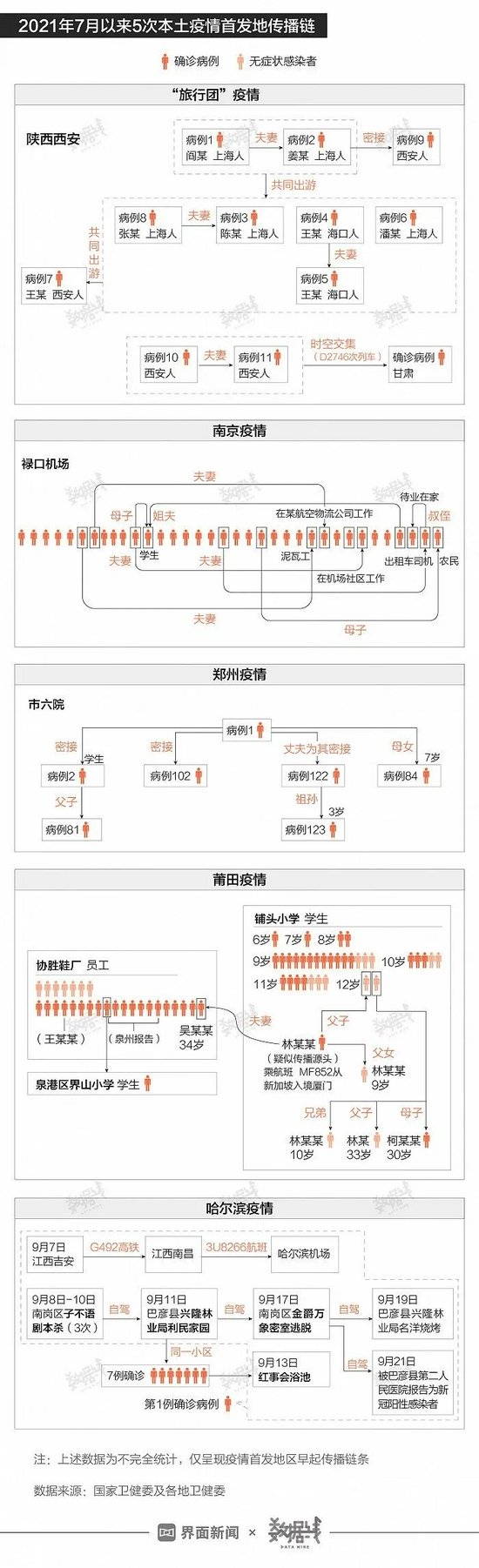 从传播链来看,此前4次本土疫情,早期主传播链多集中在“疫情首发地”,例如南京疫情的禄口国际机场传播链、郑州疫情市六院传播链、莆田疫情的铺头小学、协胜鞋厂传播链。与之相比,新一轮本土疫情传播早期的“旅行团”主传播链,就已跨区域、涉多地人员。