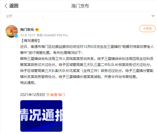 近日,南通市海门区纪委监委依纪依法对12月6日发生在三星镇的“粗暴对待卖甘蔗老人事件”进行调查处置。有关处理情况如下:
