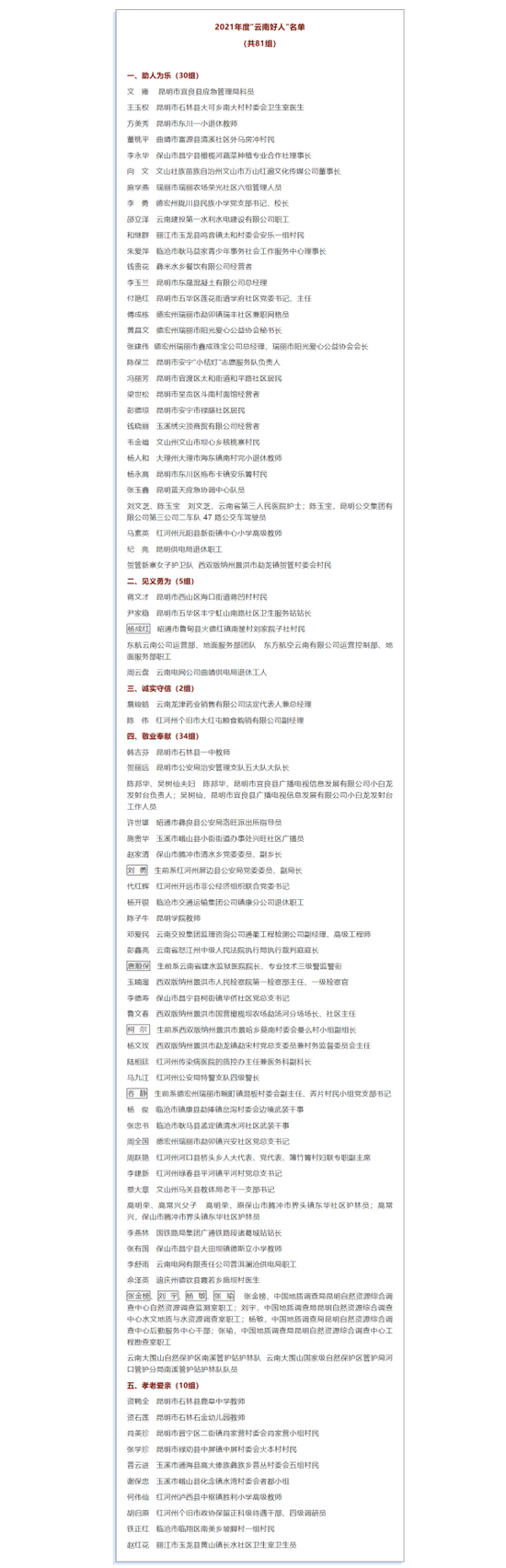 据云南文明网消息,近日,云南省文明办组织召开评审会,评出2021年度“云南好人”名单,共81组,予以公示,公示期为3个工作日(2021年12月13日至12月15日)。
