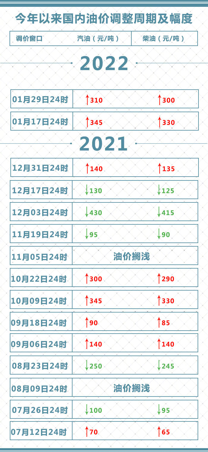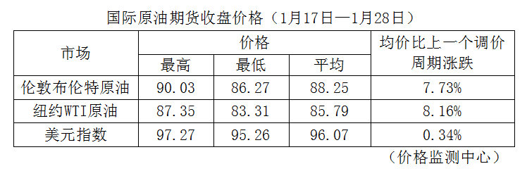 根据国家发改委消息,新一轮成品油调价窗口将于今天(1月29日)24时开启。据国家发改委价格监测中心监测,本轮成品油调价周期内(1月17日—1月28日)国际油价继续大幅上涨。平均来看,伦敦布伦特、纽约WTI油价比上轮调价周期上涨7.95%。受此影响,国内汽油、柴油零售价随之上调。