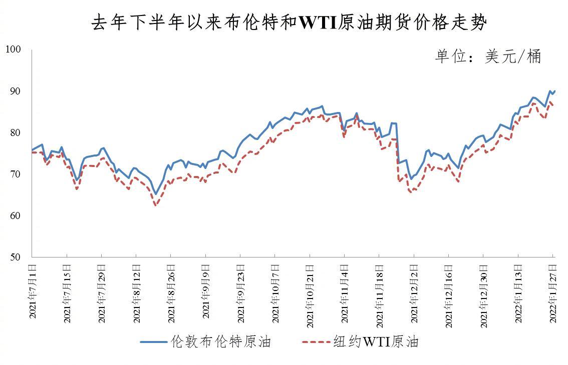 多重因素影响下,国际油价升至7年新高,伦敦布伦特油价突破90美元关口。平均来看,本轮调价周期伦敦布伦特、纽约WTI油价分别比上一调价周期上涨7.73%、8.16%。