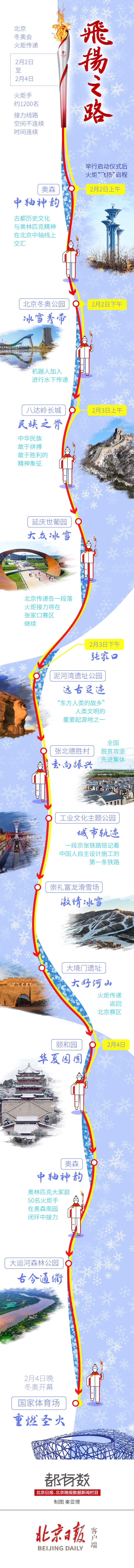 北京冬奥火炬接力2月2日至4日在北京、延庆、张家口三个赛区进行,约1200名火炬手高举“飞扬”传递圣火。这条“飞扬之路”,弘扬了奥林匹克精神,展现着中华民族风采。