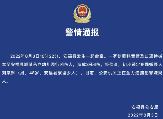 2022年8月3日10时22分,安福县发生一起命案。一歹徒戴鸭舌帽及口罩持械窜至安福县城某私立幼儿园行凶伤人,造成3死6伤。经侦查,初步锁定犯罪嫌疑人刘某辉(男,48岁,安福县寮塘乡人)。目前,公安机关正在全力追捕犯罪嫌疑人。