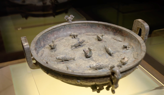 和大多数青铜器上的铭文多为纪念功绩不同,子仲姜盘的铭文告诉我们,这是太守送给妻子姜氏的礼物。可以想象,姜氏在盥洗时,看到水流冲击盘内圆雕的动物,会有多么惬意。或许在日复一日的琐碎生活中,最浪漫的事情就是保护爱人的天真——为爱人打造一座乐园,这里有鱼待游,有蛙待鸣,有绿头鸭带来春的温度。