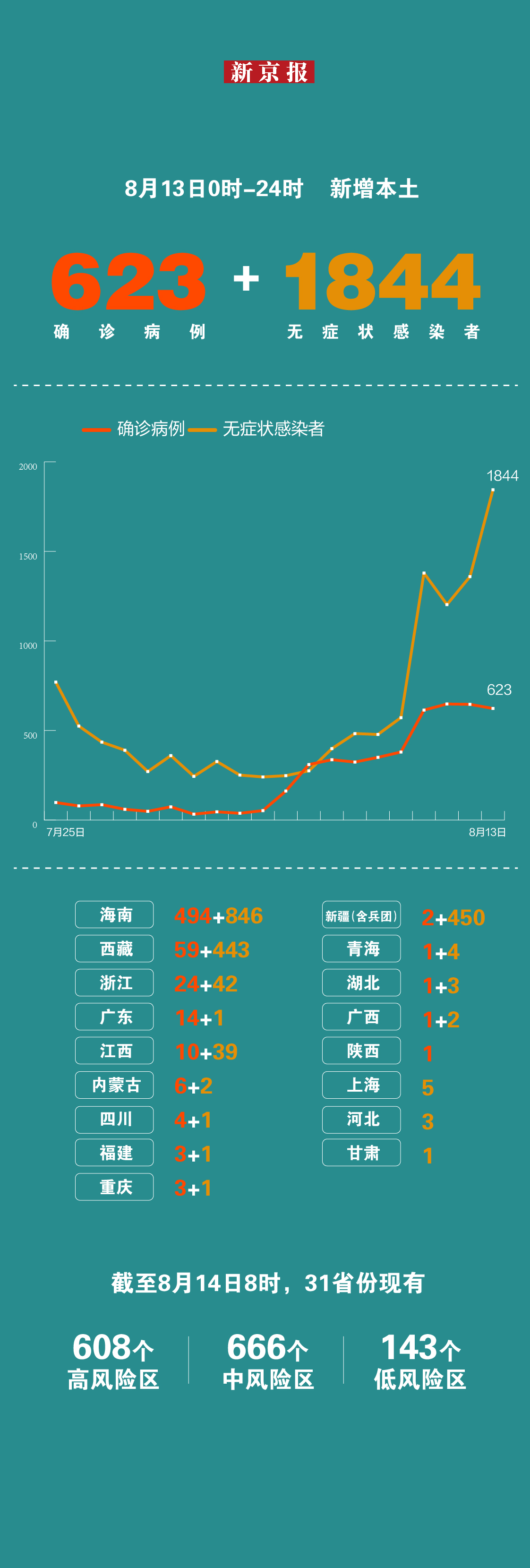 中新网8月14日电 据国家卫健委网站消息,8月13日0—24时,31个省(自治区、直辖市)和新疆生产建设兵团报告新增确诊病例684例。其中境外输入病例61例(北京15例,广东13例,福建11例,上海8例,山东4例,四川4例,陕西3例,内蒙古2例,吉林1例),含4例由无症状感染者转为确诊病例(北京1例,广东1例,四川1例,陕西1例);本土病例623例(海南494例,西藏59例,浙江24例,广东14例,江西10例,内蒙古6例,四川4例,福建3例,重庆3例,新疆2例,湖北1例,广西1例,陕西1例,青海1例),含31例由无症状感染者转为确诊病例(浙江21例,海南3例,广东2例,新疆2例,内蒙古1例,广西1例,重庆1例)。无新增死亡病例。无新增疑似病例。
