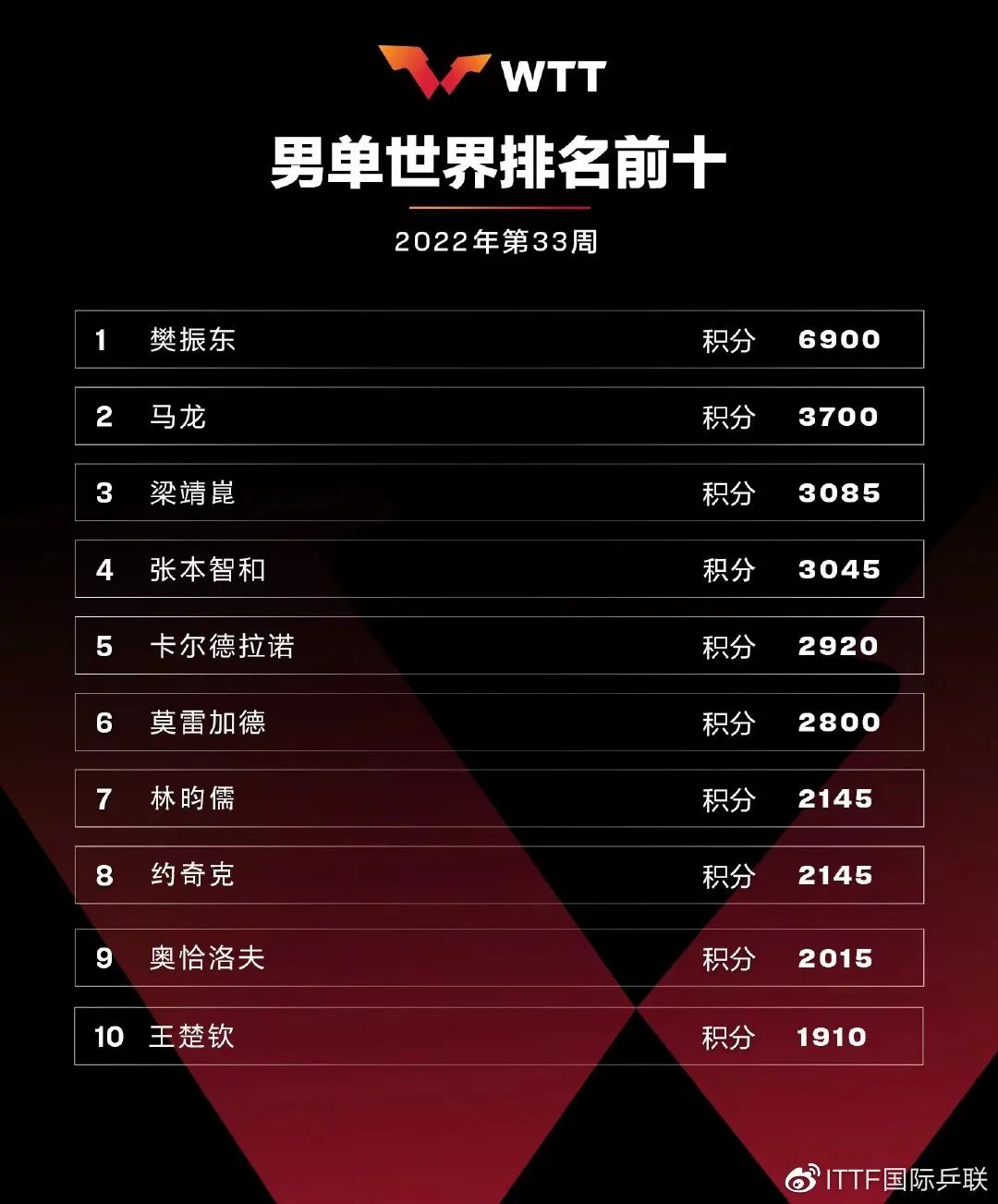 本周国际乒联世界排名男单前十无变动,中国队球员樊振东恢复之前被扣除的1400积分,恢复后总积分为6900,排名第1。马龙、梁靖崑位列第2、3,王楚钦位列第10。