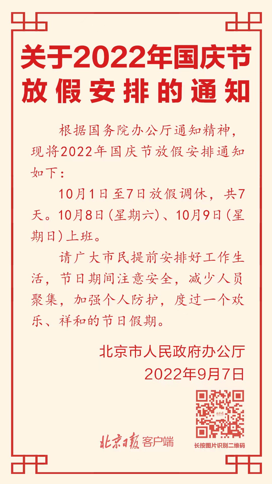 北京市人民政府办公厅9月7日发布《关于2022年国庆节放假安排的通知》: