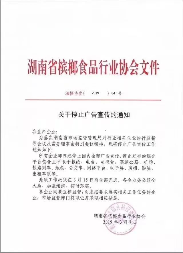 2019年,在广泛争议和舆论压力下,槟榔种植大省的湖南,出台了一份行业“禁令”——《关于停止广告宣传的通知》。该通知要求湖南所有槟榔生产企业从2019年3月7日起停止国内全部广告宣传,且此项工作必须在3月15日前全部完成。如企业未按要求落实相关工作任务,市场监管部门将取证并采取相应措施。