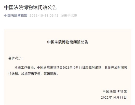 10月11日,中国法院博物馆发布闭馆公告,自2022年10月11日起临时闭馆,具体开放时间另行通知。