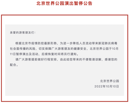 10月10日,北京世界公园发布公告,将于10月11日暂停演出及活动,后续恢复时间将另行通知。