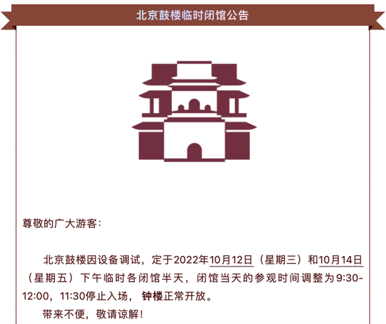 10月10日,北京市钟鼓楼文物保管所发布公告,北京鼓楼于2022年10月12日(星期三)和10月14日(星期五)下午临时各闭馆半天,闭馆当天的参观时间调整为9:30-12:00,11:30停止入场, 钟楼正常开放。