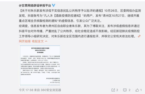 据@甘肃网络辟谣举报平台 消息,甘肃酒泉市宿州区一网民发布涉疫虚假信息,其被全区通报批评,并被移交公安机关依法处理↓