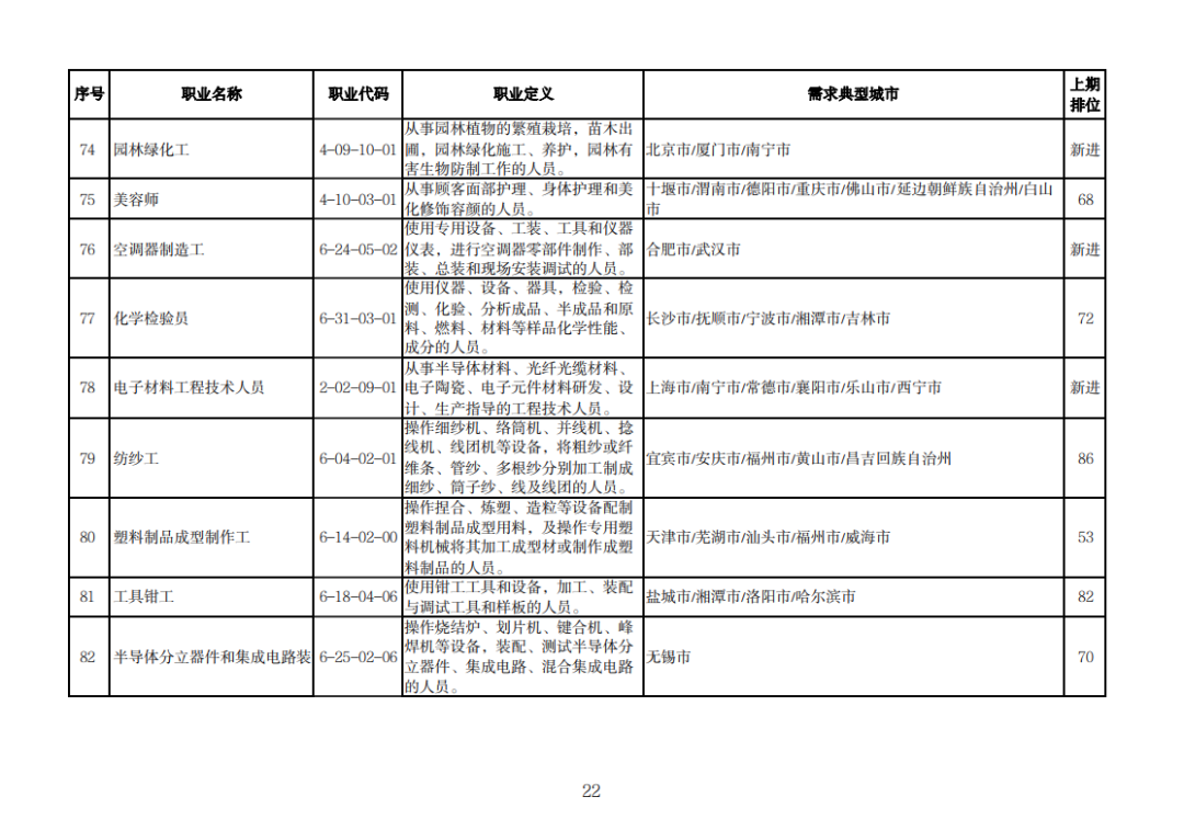 据介绍,与2022年二季度相比,制造业缺工状况持续,技术工种岗位缺工较为突出。铆工、锻造工、模具工等职业新进“最缺工”100个职业排行,车工、焊工位列排行前十,电机制造工、仪器仪表制造工、汽车生产线操作工等缺工程度较二季度有所增加;物流及运输行业缺工程度有所增加,邮政营业员、道路客运服务员新进排行,快件处理员、道路货运汽车驾驶员、装卸搬运工等职业缺工程度加大。