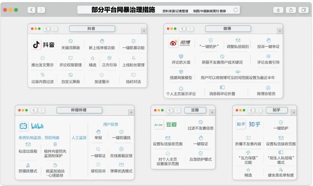 2022年以来,包括微博、抖音、豆瓣、知乎、小红书、B站在内的多个平台推出了“一键防护”的功能,即让用户一段时间内(通常是7天或14天)不会接受未关注人的私信、评论和转发信息。“设置一键防护功能”也被写进了《通知》,作为中央网信办对更多网站平台的要求。
