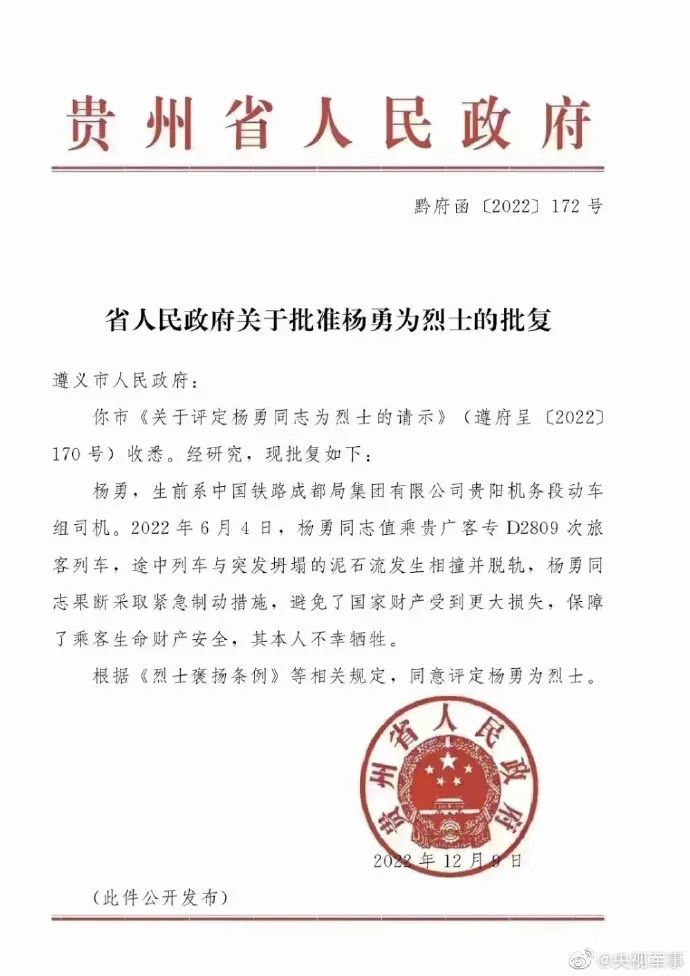 据“央视军事”12月15日报道,近日,贵州省人民政府评定D2809列车殉职司机杨勇为烈士。今年6月,D2809次列车突遇泥石流坍溜入线路,司机杨勇5秒内采取紧急制动措施,保障了车上人员安全。