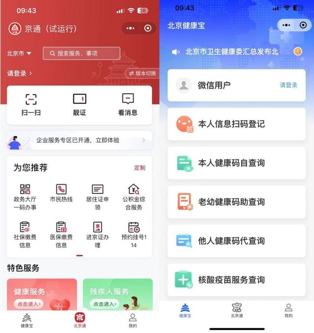 健康码使用率大大下降后,部分地区开始探索其他应用方式。12月19日,北京市启动“京通”小程序上线试运行,尝试融合“北京通”办事与“健康宝”。市民可自愿或自主授权,选择是否将北京健康宝的个人身份验证信息拓展到“京通”页面。