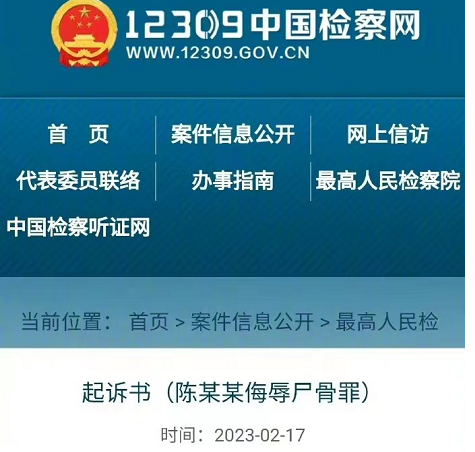 陈某某因涉嫌侮辱尸骨罪被起诉。