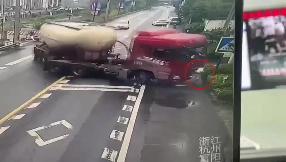 6月18日8时许,浙江杭州富阳龙门七村桥头附近,一辆直行货车为避让穿行电瓶车失控,撞向一抱着小孩的男子。