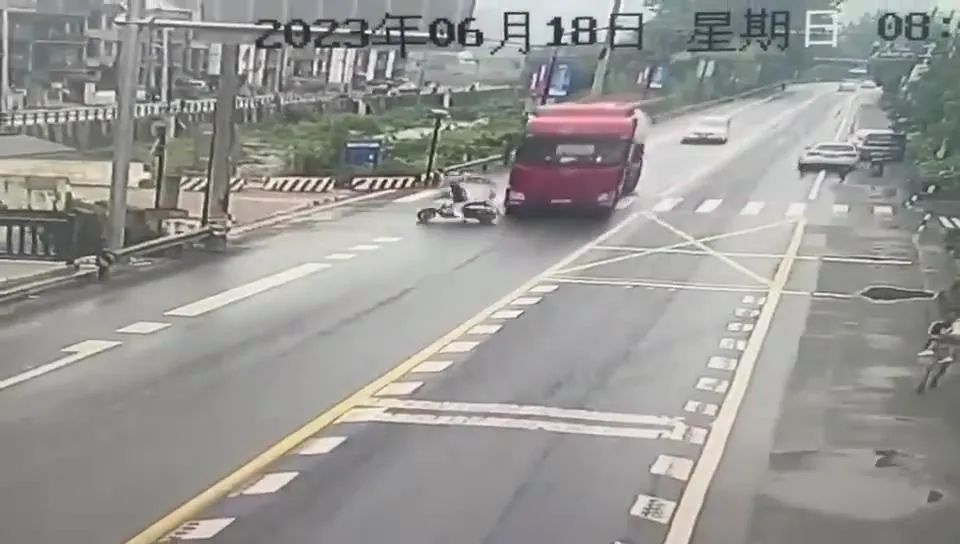 监控视频显示,6月18日8时41分50秒,一辆大货车在道路上驶来,此时一辆电瓶车正横穿道路,大货车为避让电瓶车,向驾驶员左侧驶去,撞向路边一抱小孩男子。