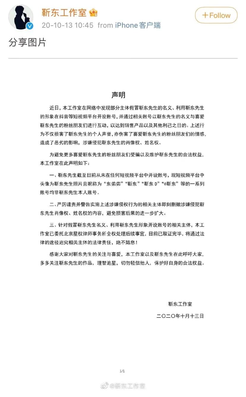 △此前报道戳图查看靳东工作室曾于2020年10月13日发布声明称,靳东在短视频平台未开设账号,涉事账号是假冒,涉嫌侵犯靳东肖像权、姓名权。工作室将通过法律途径追责。